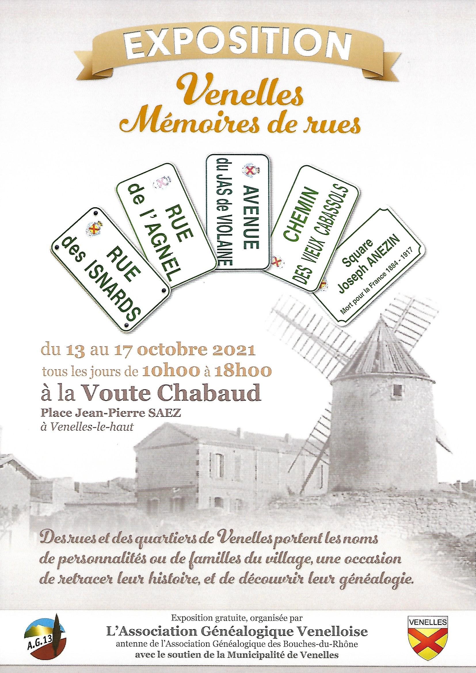 Au vu du succès rencontré par son Exposition d’octobre 2021, et à la demande de la Ville de Venelles, l’Association Généalogique Venelloise (antenne de l’AG13), reconduira l’exposition « Venelles, mémoires de rues », dans le cadre de la Journée du Patrimoine.